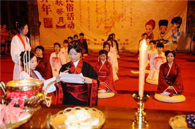在月下,將月亮神像放在月亮的那個方向,紅燭高燃,全家人依次拜祭月亮,然后由當家主婦切開團圓月餅。切的人預先算好全家共有多少人,在家的,在外地的,都要算在一起,不能切多也不能切少,大小要一樣。